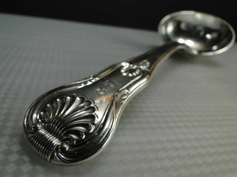 JUGEMテーマ:英国アンティーク・ヴィンテージ食器 純銀製のソースレードル ダブルストラック Georgian キングスパターン 今まで手にしたソースレードルの中では、一番の重さ116g たかが100g、されど100g・・・ 工房マークはいつも見慣れた感じ・・・ けれど、アセイマーク&デイトレターは、今まで一番の深さ? ではないかと、まじまじと眺めてしまう。 こんな贅沢なソースレードル...