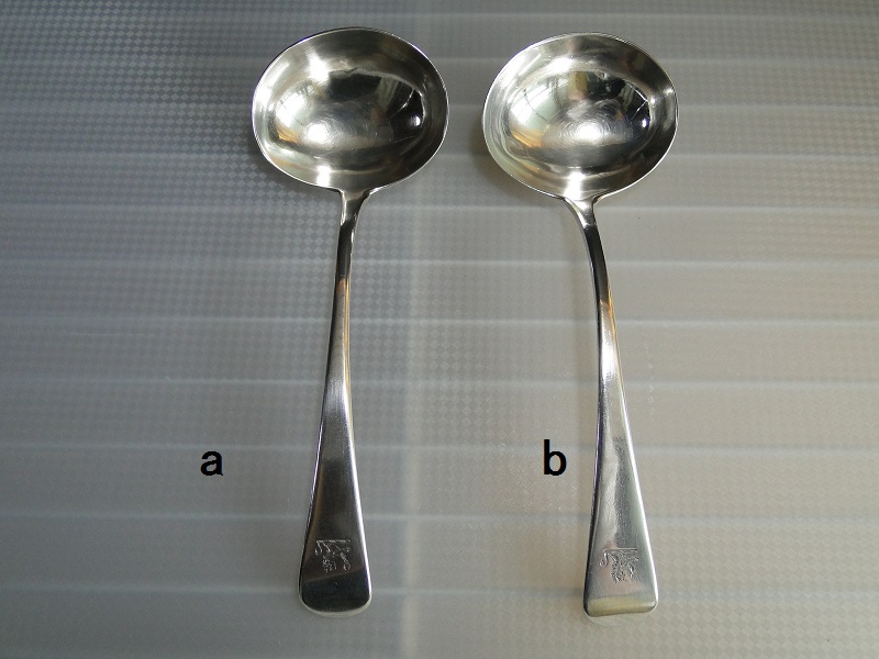 JUGEMテーマ:英国アンティーク・ヴィンテージ食器 純銀製のソースレードル 工房も年代も同じ・・・ ●原産国・アセイマーク(産地刻印):イギリス London ●デイトレター(年号刻印):[C] 1798年 ●工房:RICHARD CROSSLEY ジョージアン 使用感はかなりある・・・ スターリングシルバー solid silv...