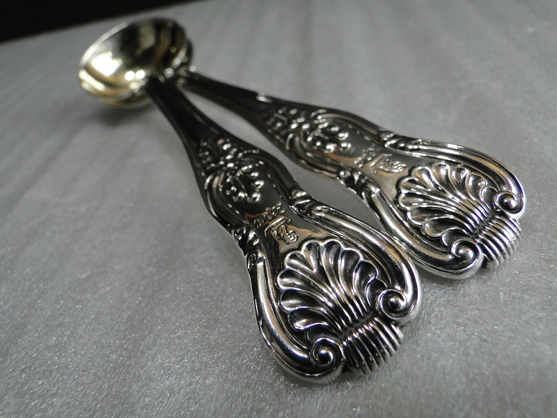 JUGEMテーマ:英国アンティーク・ヴィンテージ食器 純銀製キングスパターンのソルトスプーンペア 裏にもパターンが施されているダブル・ストラック キングスと呼ばれているのに、長さ約11cm・・・可愛い・・・ すっかり、このサイズのキングスパターン・ダブル・ストラックがお気に入りになってしまった。 ダブル・ストラックでなければ、購入しない、と思う。 gild...