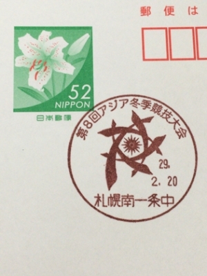 JUGEMテーマ:風景印 こんにちは! 2/19から開催されている第8回アジア冬季競技大会(略称:2017冬季アジア札幌大会)ですが、本日が開催最終日となりました。アジア冬季競技大会はアジアの45の国と地域が加盟するアジアオリンピック評議会(OCA)が、アジア地域における冬季スポーツの発展を図ることを目的として開催する総合国際スポーツ大会です。 さて、ほとんどの会場が札幌市で行われているこの大会、選手達の宿舎となっているホテル(2カ所)には臨時郵便局が開設されており、そ...