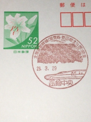JUGEMテーマ:風景印 こんにちは! 昨年の昨日、2016年3月26日はダイヤ改正とともに北海道新幹線の開業、第3セクターの道南いさりび鉄道が開業した日でした。それに合わせて北海道新幹線開業記念の小型印が開設されたので、「いさ鉄」の『ながまれ号』に乗りに行く旅の途中でその小型印を収集してきました。 小型印のデザインは2種類あって、各地の名所・景勝地とH5系北海道新幹線車両がデザインされたバージョンから紹介してまいります。 【函館中央郵便局】 ...