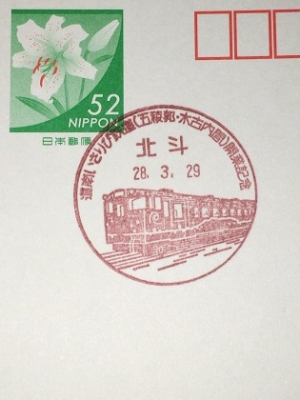 JUGEMテーマ:風景印 こんにちは! 昨年3月26日のダイヤ改正で五稜郭駅ー木古内駅間で開業した「道南いさりび鉄道」。その開業を記念した小型印もあるので、北海道新幹線開業記念の小型印の収集と合わせて頂いてきました。 【北斗郵便局】 【木古内郵便局】 地域情報発信列車「ながまれ号」がデザインされています。他にも【五稜郭駅前郵便局】、【七重浜郵便局】、【久根別郵便局】、【茂辺地郵便局】、【渡...