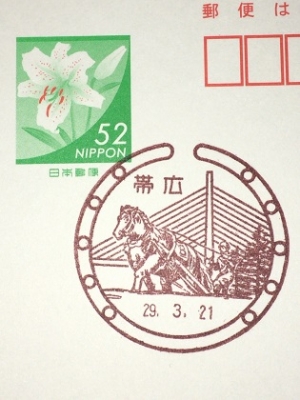 JUGEMテーマ:風景印 こんにちは! 先週、「ばんえい記念」を観戦に行った日は、JR帯広駅そばのホテルで1泊したのですが、その翌日、朝ごはんを食べた後、チェックアウトまでの間でお散歩がてら歩いて帯広郵便局まで行って、風景印を頂いてきました! 北海道遺産である「ばんえい競馬」と背景に十勝大橋、そして枠は蹄鉄でデザインされています。ばんえいファンが見れば嬉しくなるようなデザインです! 密かに風景印の馬のゼッケンは8番… 今年の「ばんえい記念」の...