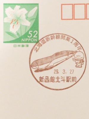 JUGEMテーマ:風景印 こんにちは! 今年の3月26日で北海道新幹線が開業して1周年。開業時もあった小型印ですが、もちろん(?)開業1周年を記念した小型印も発行されたので、今回は初日印が欲しくて郵頼でお願いをしました。 【新函館北斗駅前郵便局】 【木古内郵便局】 北海道新幹線H5系車両と北海道新幹線開業PRキャラクターの「どこでもユキちゃん」がデザインされています。 今回は北海...