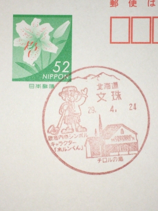 JUGEMテーマ:風景印 こんにちは! 今日は昨日に引き続いて、歌志内ドライブで収集した風景印を紹介します! 歌志内で用事を済ませた帰り道は、来た道(道道114号線・赤平奈井江線)を砂川方面に戻る途中にある「文殊郵便局」がスタートです! 【文殊郵便局】 歌志内市のシンボルキャラクター「ホルンくん」と温泉施設「チロルの湯」がデザインされています。小さな郵便局なんですが、「チロルの湯」に近い郵便局だから風景印があるん...