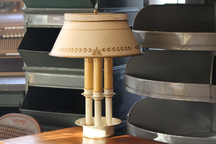 VINTAGE TABLE LAMP 3灯のテーブルライト スチール製です アイボリーに ゴールドの縁取りが 甘くなりすぎず 絶妙なヴィンテージ感です 壊れにくいので ...