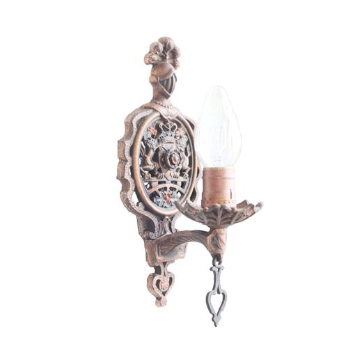 ANTIQUE WALL LAMP 騎士モチーフの 壁付け照明 中央には 盾を両側から支える 獅子の姿も! 鋳物なので 小さい割にずっしりとしていますが 風格があります 一台しかないので ここぞというところに お使いいただければと 思います &n...