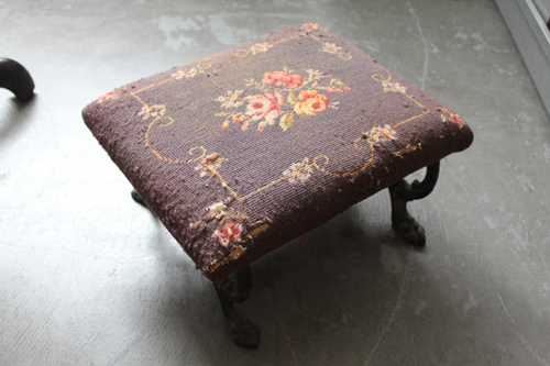 ANTIQUE FOOT STOOL 小さなフットスツール 足置きです コンディションは 要フルレストアですが 刺繍が可愛いので 張り替えないまま 時間だけが過ぎて 店の片隅にポツリ やっとの事で オーダーいただいた分の オリジナルソファ...