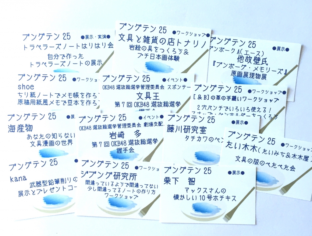 ■ブングテン25 開催します。 おはようございます。 とてもいい天気になりましたね。 本日予定通りブングテンを開催します。 会場 雑司が谷地域文化創造館 地下1Fの第2練習室、第4会議室 時間 11:00〜16:00 16時にはクローズしますので、ワークショップやOKB48握手会に参加の際には余裕を持ってお越しください。 恒例のExcel画名札、今回は水絵具です。 ブングテン出展メンバー12組+2年分のOKBメンバー48組×2、 合計108...