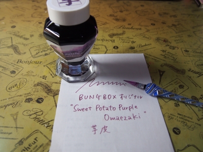 JUGEMテーマ:文房具・ステーショナリー 先にプロフェッショナルギアスリムに入れてしまったサムシングブルーのことに触れちゃったんだけど、 わたしの3色目のインクがこちら、「Sweet Potato Purple omaezaki」。 すなわち「サツマイモの紫 御前崎」という名前のインクです。 BUNGBOXオリジナルインク。店内の色見本では「芋皮」とかいてありました。 ー御前崎のさつまいもの歴史は古く、その由来は今から240年以上も前の江戸時代(1766)にさかのぼります。 当時、御前崎沖で薩摩藩の御用船「豊徳丸」が座礁し、そ...