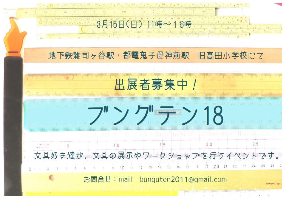 JUGEMテーマ:文房具・ステーショナリー ■ブングテン18 開催のお知らせ&出展者募集 今年最初のブングテンのご案内です。 ブングテン18 日時:03月15日(日) 11:00〜16:00 ※ 当日、鬼子母神通りみちくさ市(古本市)と同時開催です。 場所:雑司ヶ谷 旧高田小学校職員室 交通:地下鉄 雑司ヶ谷、都電荒川線鬼子母神前駅から徒歩8分 入場料等:無料。※一部ワークショップ等で有料のプログラムがございます。 ◆ブングテン18の出展者を募集します。 ・ブングテンは、文房具好き達が集まって、文房...