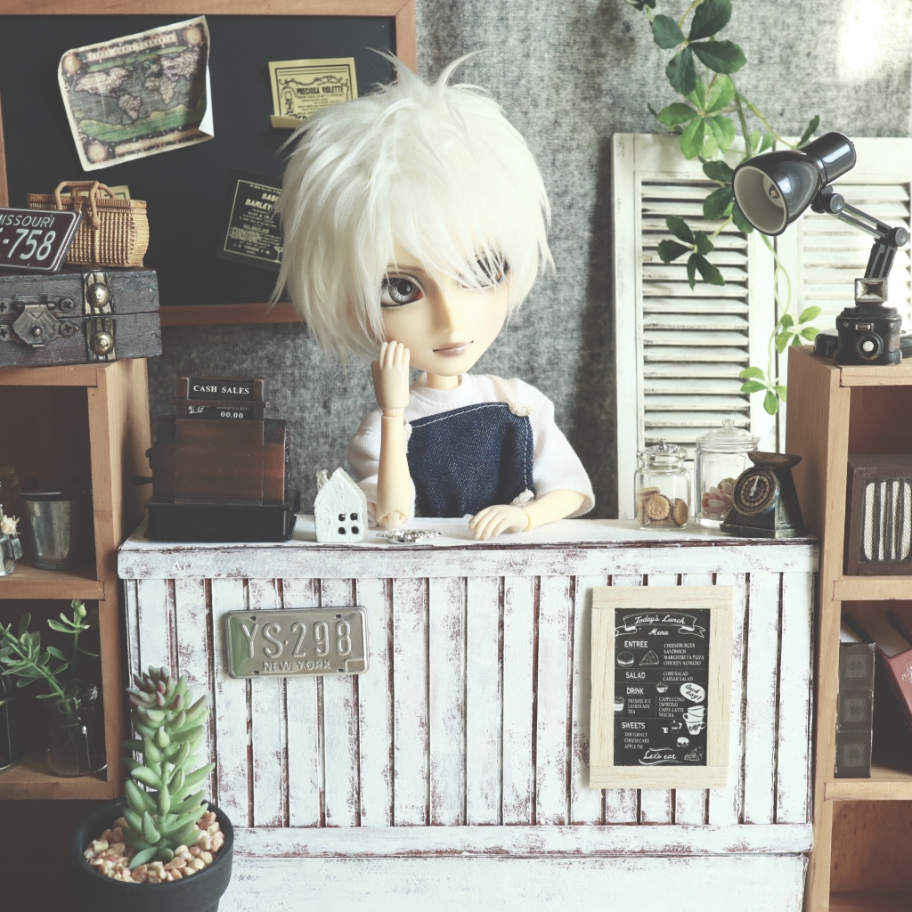 執事さんの写真です。 気に入っているスタンドカラーシャツセットを着せてみました。 キャンプ用に連れていく用に作った拙い帽子も被せて(笑) 有孔ボードの背景可愛い。 では…。