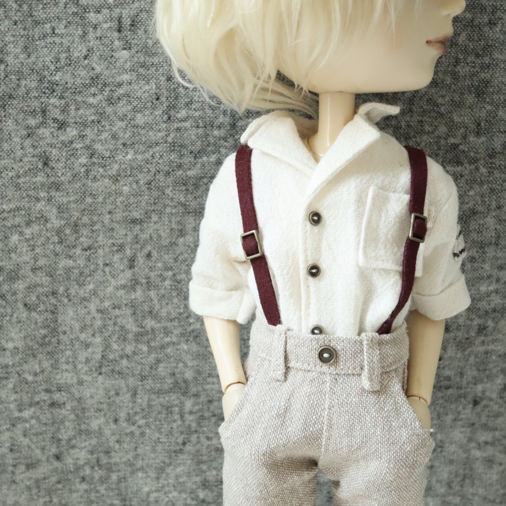 JUGEMテーマ:ドール 今週販売予定のお洋服です。 久しぶりにサスペンダー付きパンツを作ってみました。 最近はまっているオープンカラーシャツと組み合わせて。 あとはパンツにベルトループをつけようかなと思います。 服作り中は顔のついてないテヤンボディを使って確認してるので、首から上は撮れないという笑 では…。