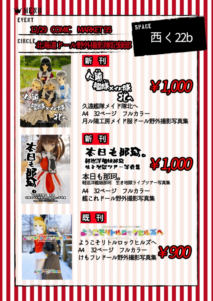 コミケまで残り10日を切りました。 お品書きをここでも公開しちゃいますよ! 新刊は各20部、既刊は10部会場にもって行きます。 また新刊「久遠艦隊メイド隊北へ」と「本日も那珂。」を同時購入してくれた方にはクリアファイルを をノベルティとしてプレゼントします。 それではどうぞよろしくお願いします!