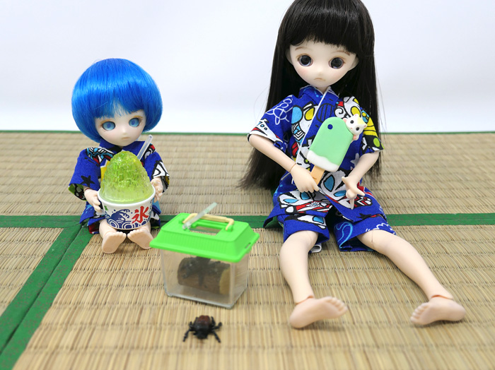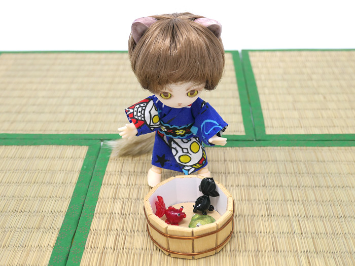(LumixTX2) 「はっ・・・!」 「金魚かわいー。いじめないよたべないよ〜」 「きつねうどん食べるから」 「お揚げでっかい!」 ちびリュックん(ヒカリヘッド、キューポッシュボディ)に浴衣縫いました。 この夏休みは久しぶりにドールに染まると決めていたのです。 他にパラドール用の甚兵衛2セットと、ブライス用にワンピを2着作成。 これまた久しぶりに新ガチャも購入してみました。 カップ麺とハムスターアイスと...