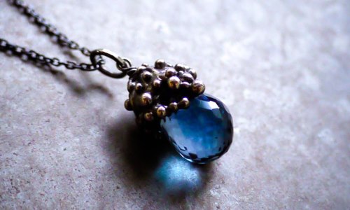 ――恵みの種から芽吹いた蔓は、ほんの数日で鉢からあふれだし、 家を覆い尽くし、花を咲かせ、ずっしりと重たい実をつけて、 その実をばらばらと地面に落としました。 銀色の実が割れると、中から現れたのは果肉ではなく石でした。 豊かな実りを望んだ我々の希望を裏切り、その宝石は陽を受けて ただ美しく輝くばかりでした。―― ――ある籠売りの話より 植物の実のような、粒々とした銀の殻から 鮮やかなディープブルーのロンドンブルートパーズが...