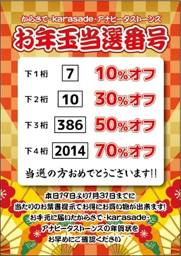 JUGEMテーマ:宝石・貴金属JUGEMテーマ:パワーストーンJUGEMテーマ:恋愛/結婚JUGEMテーマ:モブログJUGEMテーマ:天然石アクセサリーJUGEMテーマ:天然石・原石・ルース 今日は、、、19日 やってまいりました〜!! 「お年玉年賀ハガキ当選番号」 大・・・・発表会〜 (注意:通常の郵便局のお年玉付き年賀ハガキの当選発表ではございませんのでご注意を!) じゃん!! いかがでしたか? 最大70%OFFを手にしたお客様・・いらっしゃいました? 画像にも書いてあるように...