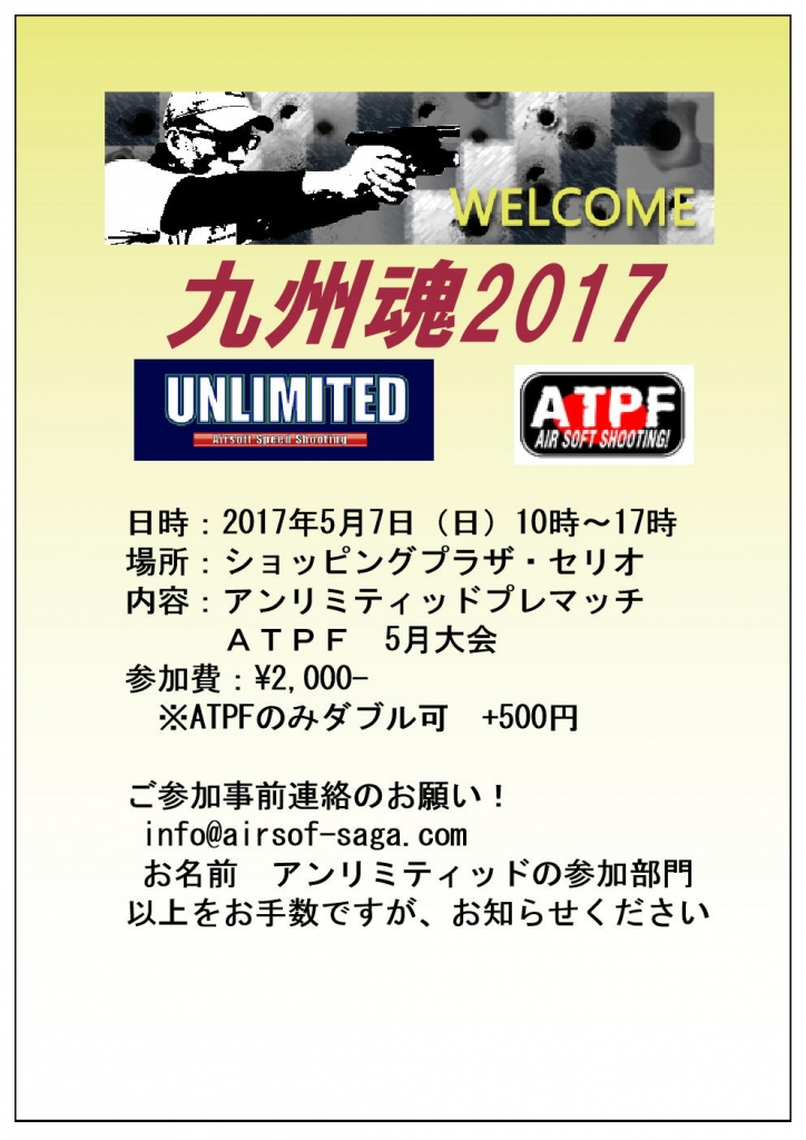 【ATPF&リミティッド記録会のお知らせ】 日時:2017年9月3日(日) リミティッド記録会 10:00~12:30 ATPF 9月大会 13:00~15:30 3ガン・ゼミ 15:30~16:30 参加費:¥2000− 連絡先:info@airsoft-saga.com 090-8403-4373(中原) みなさん、まだまだ暑いですが奮ってご参加くださーい! 【リミティッド戦士たち】 11月に東京で開かれますリミティッド(スピードシューテ...