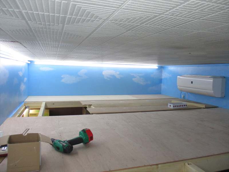 JUGEMテーマ:鉄道模型 前回に続き、鉄道模型レイアウトルーム建設日記です。 前回、とりあえず台枠が出来上がった状態でしたが、一週間で、電気配線工事、照明工事を終え、空とフラットトップの地面ができてきた状態です。 フラットトップを設けずに根太から勾配ごとにポストを立てて道床を敷く方法もありますが、私は、一番低い位置に5.5ミリのベニヤを敷きつめて、その5.5ミリのベニヤを基準に地形や勾配を作るというやり方が好きなので、この方法で工事を進めています。 前回も書いたように、外周には近鉄特急が複...