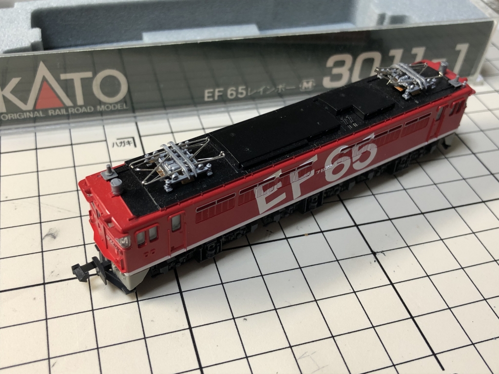 JUGEMテーマ:鉄道模型 どうも、まゆねこです。 EF65 1019号機と言えば、有名なレインボー機ですね。3011-1なのでKATOのいにしえの製品になります。 この前、オークションで落としました。それの整備記録です。 ↓品番 3011-1 懐かしい仕様の製品ですね。 さて、まずざっくり確認しますと、片エンドのパンタグラフが破損してるのと、動きが悪いですね。屋根上もホコリが溜まってます。車輪は思ったほど汚れてはいませんが、動きが渋い訳を探しながら掃除します。 ライトは片側がLED...