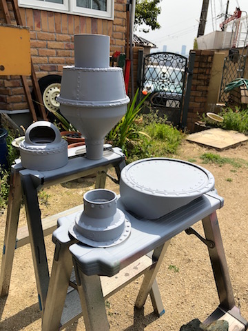 JUGEMテーマ:鉄道模型 2020年4月17日、予報が明日から雨模様になると言うので、晴天が続いている間に塗装の準備を進めます。 下塗りをしました 作った部品が、金属・プラスティック・紙と色々な素材が混じっているので、塗装の乗りを良くするために「非鉄用下塗り材」を吹き付けた後、「プラサフ」を全体に吹き付けて本塗装に備えます。 太陽が、シンナー臭を吹き飛ばし塗膜を硬くしてくれます。 本物っぽい(自称) 遠目に見ると...