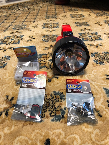 JUGEMテーマ:鉄道模型 2020年4月8日、天気が良いので屋外に出て小物を作ります。 ボディーが大ぶりなので、バランスを考え大径の前照灯を懐中電灯を使って作ります。 電池付きで500円ほど 頭の部分を切り取ります スイッチ・電池などの本体部分を全て切り取り、光るところだけ使います。 別に電池ボックスとスイッチをつけ、遠隔でオン・オフが出来るようにします。 それらしく見えるように、プラ板でレンズの上方に飾りの庇...