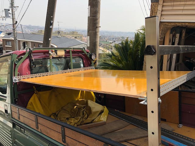 JUGEMテーマ:鉄道模型 2019年4月5日、昨日の続きで運搬車を整備します。 今日は二段目の床を作るため、DIY店でアングル材を買ってきました、これを昨日取り付けた後部の縦柱に取り付けます。 二段目は、床から70cmの高さに決定そこに床を付けます。 既設の穴にボルト締め L字型のアングルが二段目の床になります 手回しでボルトが外せるように「蝶ナット」を使用。 前方はトラック本来の鳥居に穴を開けて取付ま...