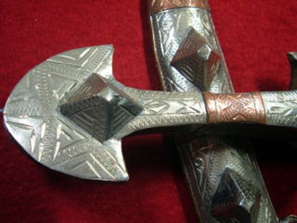 JUGEMテーマ:アンティーク 珍しい外観の短剣ですが、モロッコ製のアラブの短剣のレプリカです。かなり古いものですが時期は不明です。鞘、柄などの外装は金属ですが、材質は不明です(磁石はくっつきません)。外装は細工を施した模様が入っています。刀身は頑丈な鉄ですが、古いものなので、錆びていて、切れません。全長39.5センチ、刀身20.3センチ、重さ330グラム。