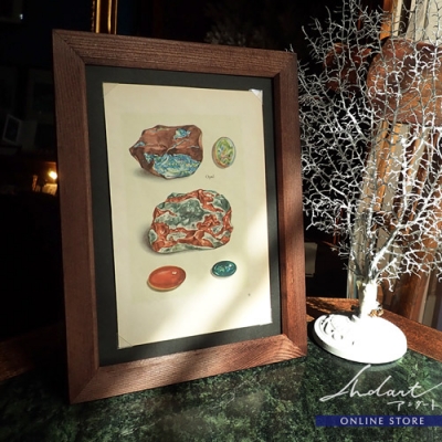 美しく繊細に描かれた鉱物のビンテージの図版です。 両面に描かれているため、お好きな方を表にしてお飾りください。 すぐにお飾り頂けますよう、簡易額装にてお届けいたします。 描かれているのはオパール(蛋白石)とトルマリン(電気石)。 リトグラフによる柔らかな色合いをお楽しみください。 * お求め...