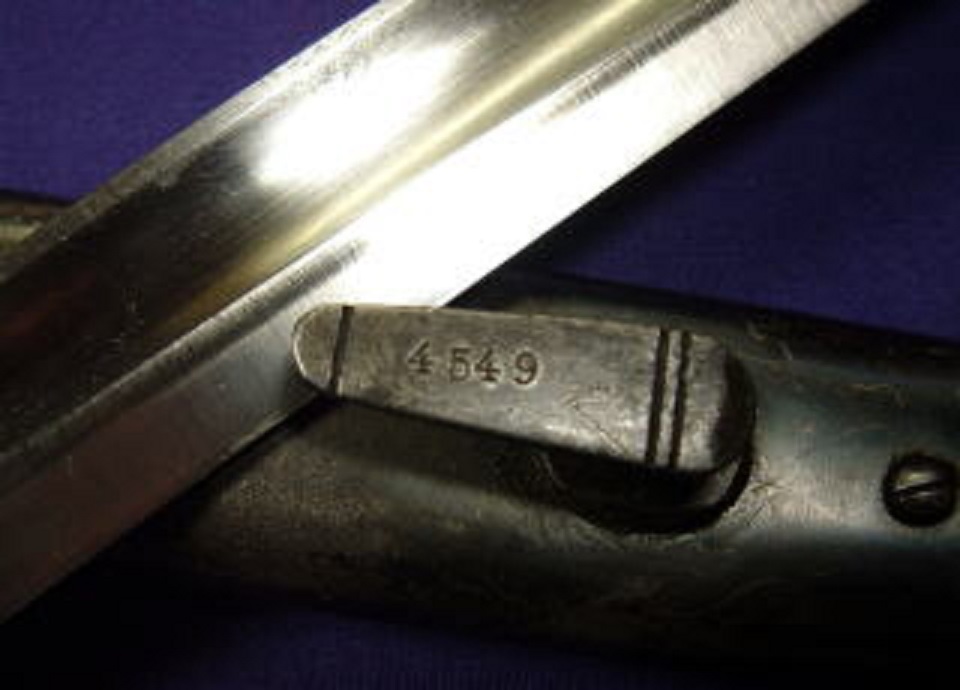 JUGEMテーマ:アンティーク ドイツ軍の銃剣の実物です。第二次世界大戦で使用された銃剣です。金属製の鞘は黒のペイントですが時代によるハゲがあります。鉄製の刀身は切れませんが鋭利です。柄は時代のくすみがありますが、硬木と鉄製です。鍔と鞘に「4549」の番号が刻まれています。鉄鞘を含めた全長は43.5?、銃剣の全長は41.5?、刀身28.2?です。重さ550g。