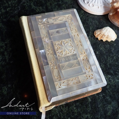 こちらの聖書は、美しいマザーオブパールを手彫りして表紙と裏表紙を制作されており、小口には金の加工( 三方金 )がされています。 その煌きは美しいだけでなく、紙の変色や収縮を防ぎ、書籍を格段に長持ちさせる為の技法です。 本の状態もとても良く、長い時を大切にされていた事が伝わって来るようです。 ...