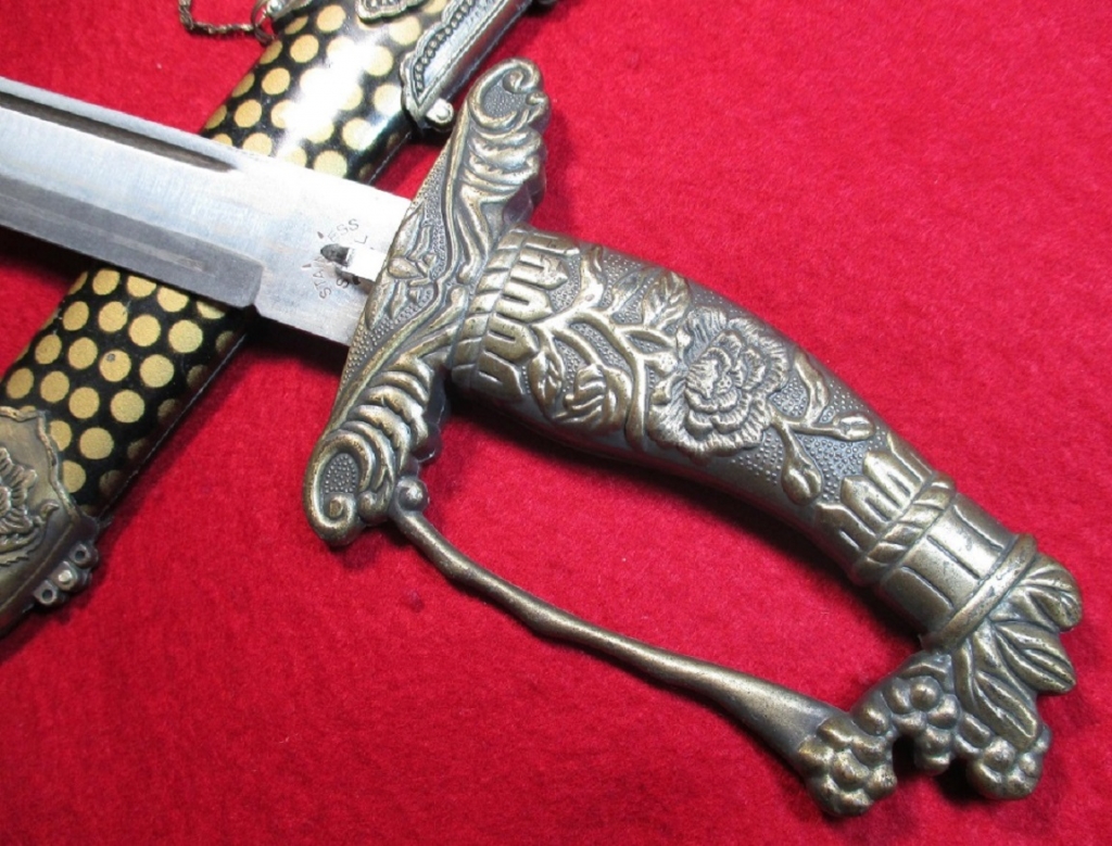JUGEMテーマ:アンティーク アジアの装飾短剣ですが、「牡丹」の花を描いたデザインで、全体的に手の込んだ装飾が施され、美術品のような、珍しい短剣です。古いものですが、アジアまたは中国の物との事ですが詳細は不明です。この短剣の鞘は、金属で、黒地に金色の水玉模様が基調で、下部には牡丹の花がデザインされています。上部にも草花が象徴的にデザインされ、ストッパーも付いています。鍔も金属で草花がデザインされています。柄も全て金属で牡丹の花がデザインされており、ガード(護拳)も草花の一体化として...