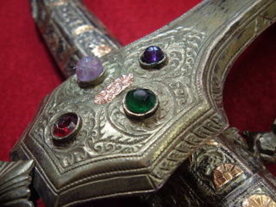 JUGEMテーマ:アンティーク 柄は大理石の上に銀の装飾が施されています。鞘は木製ですが表面に銀細工が貼られており、手の込んだ模様の装飾がしてあります。裏面は布が貼られています。刀身は切れませんが、磁石がくっつきます。吊り具付。全体的に独特の気品があり美しく、美術品の趣があります。短剣本体の全長(鞘の曲がっている部分の底までの長さ)31センチ、刀身17センチ、重さ700グラム。ケースのサイズは縦38センチ、横最大34センチ、高さ(厚さ)6センチ。