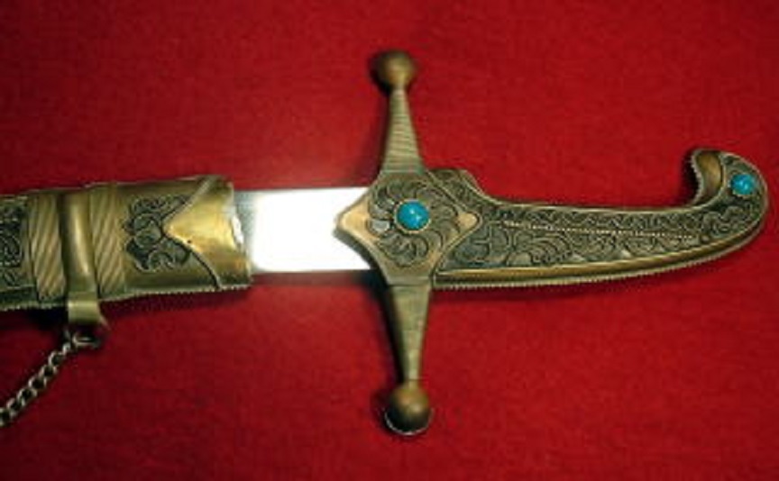 JUGEMテーマ:アンティーク 半月刀は、振り下ろして斬る時使いやすいように刀身が婉曲しており、乗馬で戦う時に使用されます。柄、鍔、鞘などの外装は真鍮で、カラーストーンや凝った模様で装飾されています。刀身の材質は頑丈なステンレスです。 全体の重さは780グラム。全長は68センチ、刀身は52センチ。
