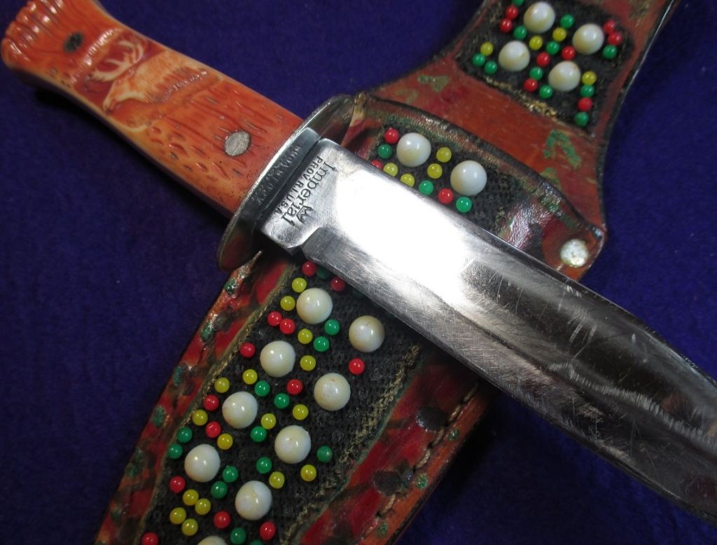 JUGEMテーマ:アンティーク アメリカのハンティングナイフです。シースは本革でビーズでデザインされています。全長23センチ、ブレード12.5センチ、重さ120グラム。