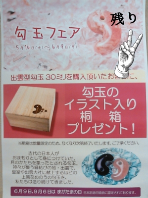 JUGEMテーマ:天然石アクセサリーJUGEMテーマ:鉱石鉱物 おはようございます伊藤です〜!(^^)! ご好評いただいている30ミリ勾玉ご購入での桐箱プレゼント・・ 追加入荷もございましたが、 なんだかんだで残り2点となってしまいました〜!!! 明日、6月9日は勾玉の日\(^o^)/ この機会に、ぜひとも30ミリの良さに触れていただきたく思います! 新デザインも随時追加中でございます もこもこ〜(*^_^*) ちょっとドレッシーな感じで勾玉を着けるのも素敵では!? と作ってみました ...