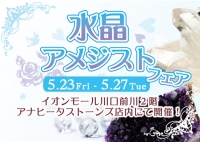 JUGEMテーマ:鉱石鉱物JUGEMテーマ:パワーストーン 5/23(金)〜5/27(火)まで水晶・アメジストフェアを店内にて開催します☆珍しい水晶や、綺麗なアメジストなどが5日間限定で川口店にやってきます♪是非、見に来て下さい☆とっても癒されるに違いないパワースポットですヾ(´∇`)ノ5/1〜5/11まで母の日フェア開催♪母の日の対象商品を購入すると、、、当店のポイントが8倍!是非、母の日の贈り物に天然石を♪こんにゃちすあえての噛みですw今朝の地震、大丈夫でしたか上から、掛け時計とか重たい物、落下してませんか?...