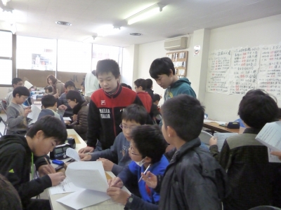 当日はクリスマス会で参加者が総勢50名近く集まり大賑わいでした!! 早い子は8時半前から来ているので来ている人から順番にテストをしていきました。 みんな難しかったようです!240点満点中最高点を獲得したのは199点の三好 輝來君でした!! おめでとう!意外だったのは、みんなプロ棋士の名前をよく知っているな〜と思いました。 次は団体戦を行いました。 団体戦は、有段者の部と級位者の部に分けて予選を行いました。 それぞれのクラスで1位のチームが決勝戦を行うシステムです。 団体戦では四...