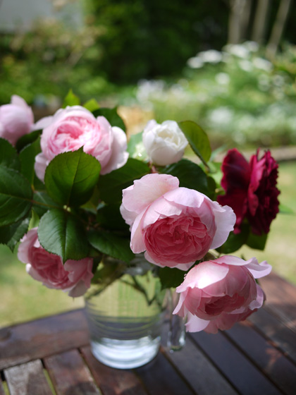 JUGEMテーマ:ガーデニング JUGEMテーマ:バラの咲く庭 最初に買った苗がもう8年選手のバラ達。 病気が多かったりするので、地植えにせず鉢植えにしています。 次々に咲いていくので、2日に一度ぐらいカットして部屋に飾ったりしています。 イングリッシュローズが殆どで、名前は・・・・・・ど忘れしちゃった。(笑) 強香の種類を選んたので、ホントいい香りなんですよ。 庭のテーブルに飾った...