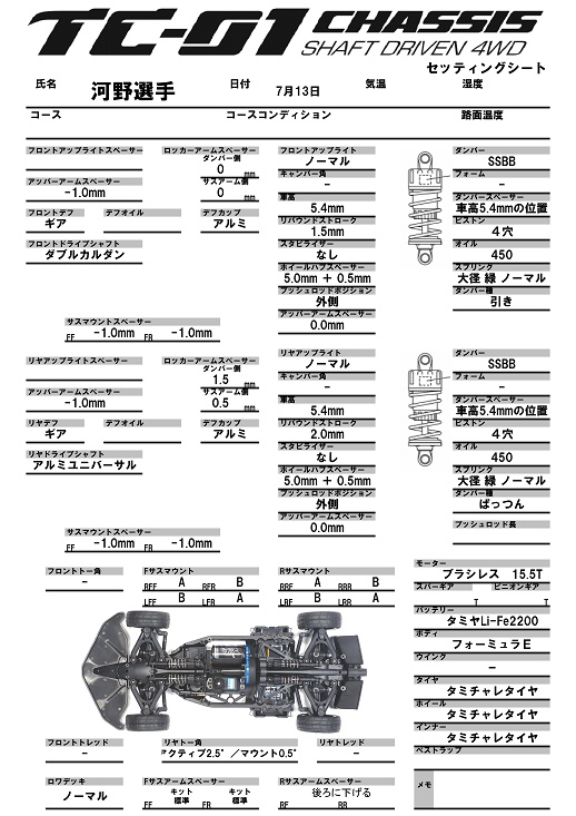 JUGEMテーマ:ラジコン・模型 7/13 YOUTUBE タミヤRCライブでTC01最新情報がアップされました。 ライブの内容は開発に関わったTRF河野選手のTC01セッティング内容についてです。 https://www.youtube.com/watch?v=Jtb64A0xq48 https://www.youtube.com/watch?v=RMtRQZFeGKI こちらで聞き取れた範囲でのセッティング内容をこちらに記載します。 ====================================== 静岡県浜松市でラジコンやってます。 ラジコンに興味ある方や、始...