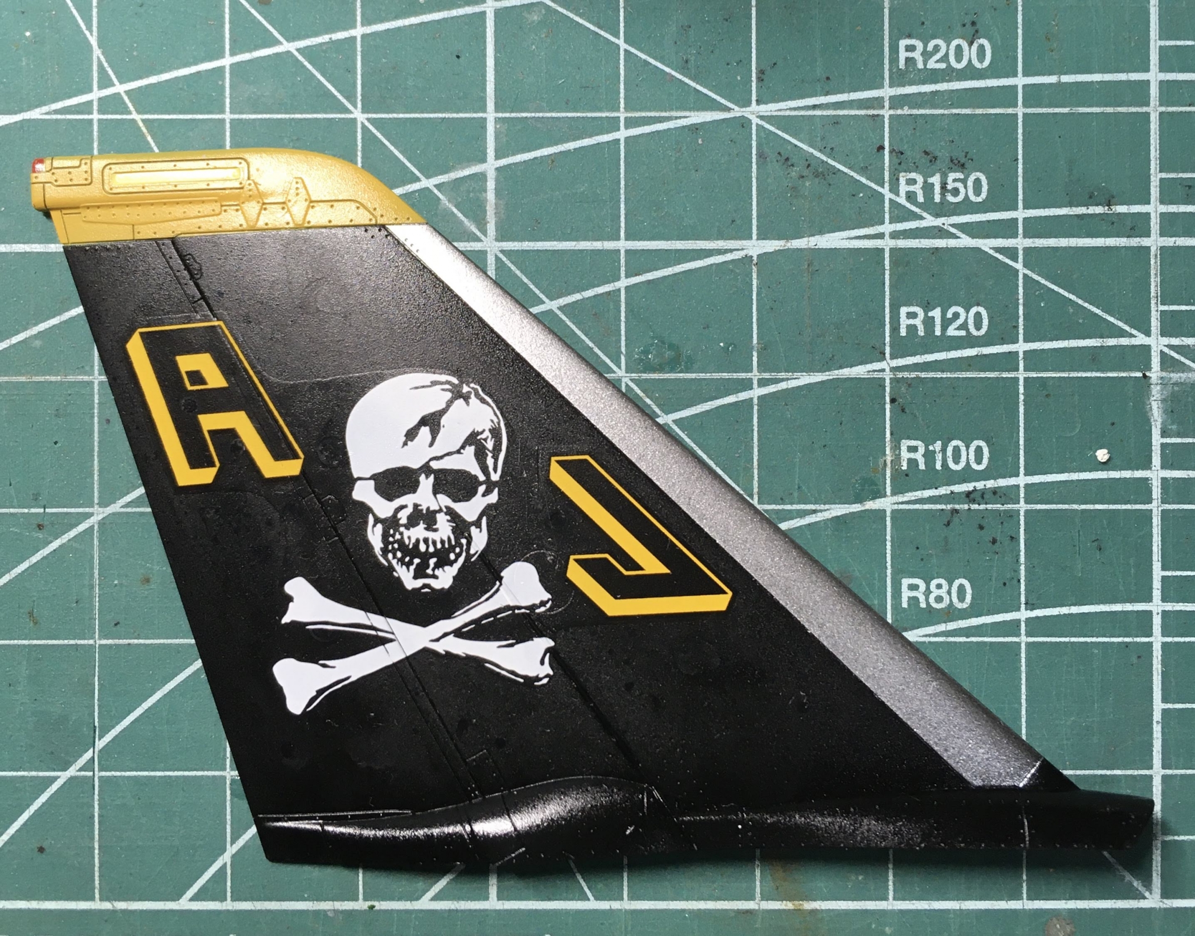 JUGEMテーマ:プラモデル JUGEMテーマ:ラジコン・模型 いらっしゃいませ る〜む335 です ようやくデカール貼りの工程が終わりました。 乾燥を待って、表面の糊っけを拭取り、いよいよ組み立てです スカル&クロスボーン、此のマーキングを完成させるのは初めてです。 過去に一度F-14Aを作ったときはブラックバーニーでした。 位置合わせに苦労しましたが、無事に貼り終わりました。 エンジンがちらりと見える! 丸一日は乾燥に時間を...