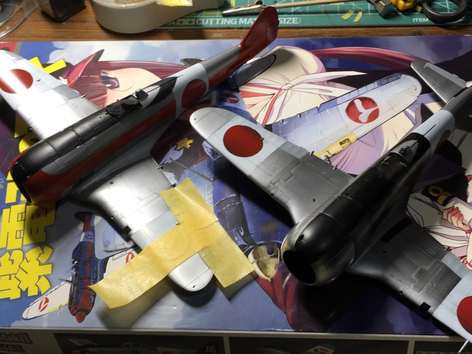 JUGEMテーマ:プラモデル JUGEMテーマ:ラジコン・模型 いらっしゃいませ る〜む335 です 頑張って三本目行きます。 鐘馗のマスキングを外し仕上げに入っていきます。 リカバーが必要な処もありますが、及第点です。 赤帯の方はウ〇ト〇マ〇のJET ビートルを彷彿しますね。 リタッチ終了。識別帯を塗装するためマスキング。 機首カウリングのみガイアカラー:スターブライトシルバーを使いました。 こちらはこれからリカバー・リタ...