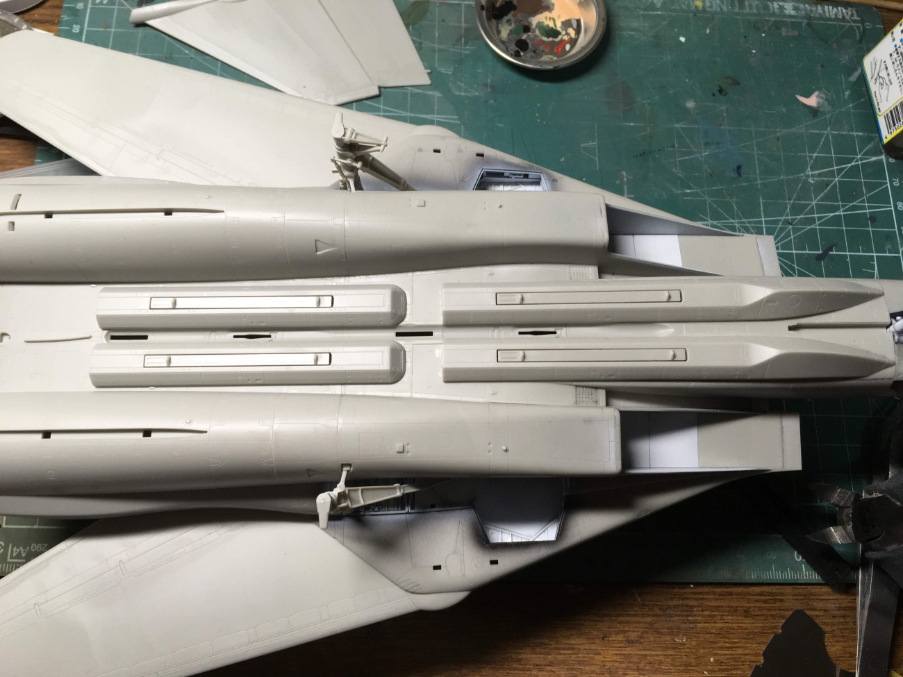 JUGEMテーマ:ラジコン・模型 いらっしゃいませ、『る〜む335』です こんばんは。 夜遅くに浅間山の噴火という緊急速報に驚きました。 お近くにお住まいの方はくれぐれもご注意ください 日中暑くてほとんど仕事にならず日が暮れにようやく作業部屋へ という体たらくな毎日です。 F-14A一寸だけ進みました ウェポンラックを機体下面に取付けました。 今回はフル武装の状態で仕上げていきます。 左右の主脚を組み立てて現在仮組みつけ状態で接着の乾燥待ちです。 ...