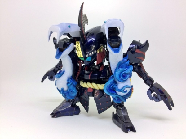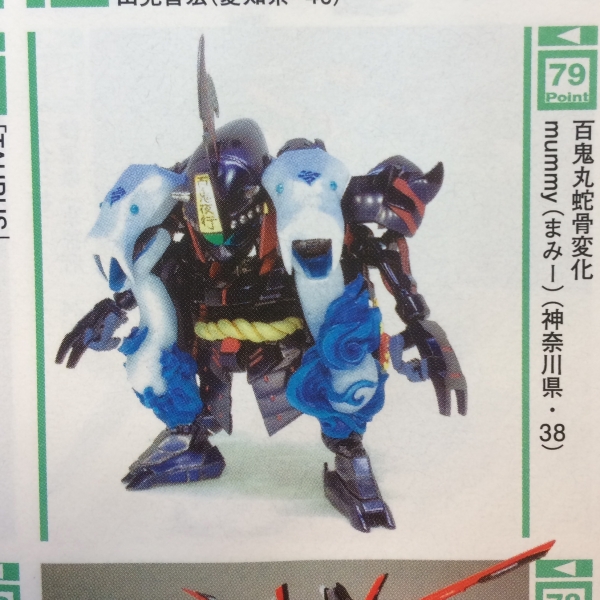 続きです。 今回のオラザク投稿は資料を出力し郵送する形をとりました。 郵送した資料から抜粋↓ SD戦国伝の百鬼丸が闇皇帝の刀を自らの体内に封印する事で、その力を制御し巨大化する忍術を得た姿を妄想しました。 バルバトスのフレームの高可動域を利用して、膝と股関節と肘を曲げるだけでSD体型に変形する機構を 思いつき、子供の頃に印象深かった百鬼丸のキャラクターを被せました。 それでは忍法「蛇骨変化」! 黒い部分と白蛇を缶スプレー重ね吹き、他はファレホの筆塗りで...