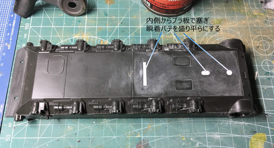 いらっしゃいませ、『る〜む335』です さて、アスカモデル 74式改(G) を始めました。 取説の1番です。 タミヤの74式はその昔、可動モデルだったので車体底部に穴が開いています。 流石に無視できないので、埋めました。 ここまでは、問題なく組めています(初っ端から問題あると怖い) サスペーションも専用治具が入っているので、安心して組み立てられます。 穴埋めや脱落防止の細工に手間取りましたが、まぁまぁ普通の工作工程で無難に...