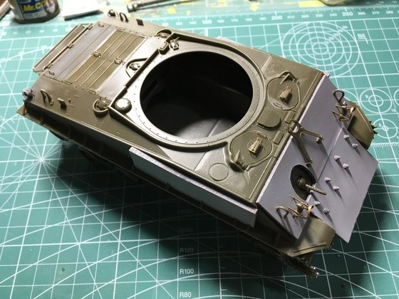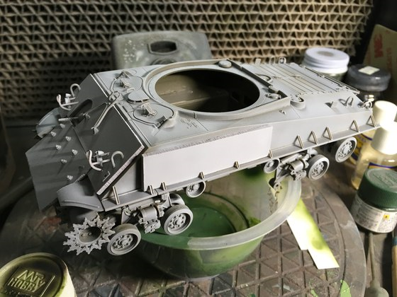 JUGEMテーマ:ラジコン・模型 いらっしゃいませ、『る〜む335』です EZ8をすすめました。 付属のレジンパーツを所定の場所に貼り付けて エッチングやプラパーツを貼り付けて 車体はほぼほぼ組みあがり。 足回りが中途半端なのは履帯を取り付けながら サスペンションを付けなければいけないので 一寸中途半端にしています 最後は砲塔、一寸合いが悪いのでクランプして乾燥中です このあとは、サフ吹きです デワデワ!! **********************************...
