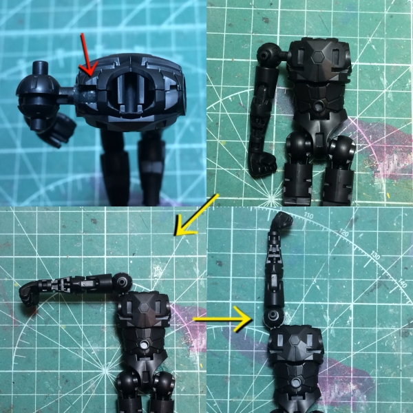 続いて肩関節をいじりました。赤い矢印部分、胸の合わせ目を切り開き、 肩の軸が90°上に回る様にしました。あとは元の球状の肩関節の回転で腕を胸の上まで移動できます。 ザブングルの腕の移動に近いとおもいます。 これで横幅が縮まり船体に収まる様になりました↓ 素体の変形が決まってきたので、外装の分割と移動をイメージしやすくなりました。 更に外装を分割していきます。 船首形状もノーチラス号の“顔”なのであまり形を崩さず、人型時に目立つ場所に移動させた...