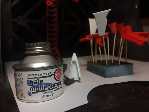 このキットはABS樹脂製で塗装後の剥離の危険性大なので、普通のサーフェイサーやプライマーよりも強力なガイアマルチプライマーを薄めてエアブラシで吹き付けました。 最終的に赤以外になる部分のみサーフェイサーを吹きました↓ 万が一でも塗装が剥げるのが怖いので、塗装部分はマスキングせずに、赤い部分は薄めたファレホを筆で数回塗り重ねました。 日光にかざすと赤い部分だけ透けてしまいますが、一番搾りをあおっているので気になりません。d(* ̄  ̄*) ツイッターでつぶやいたおふざけ↓ ...