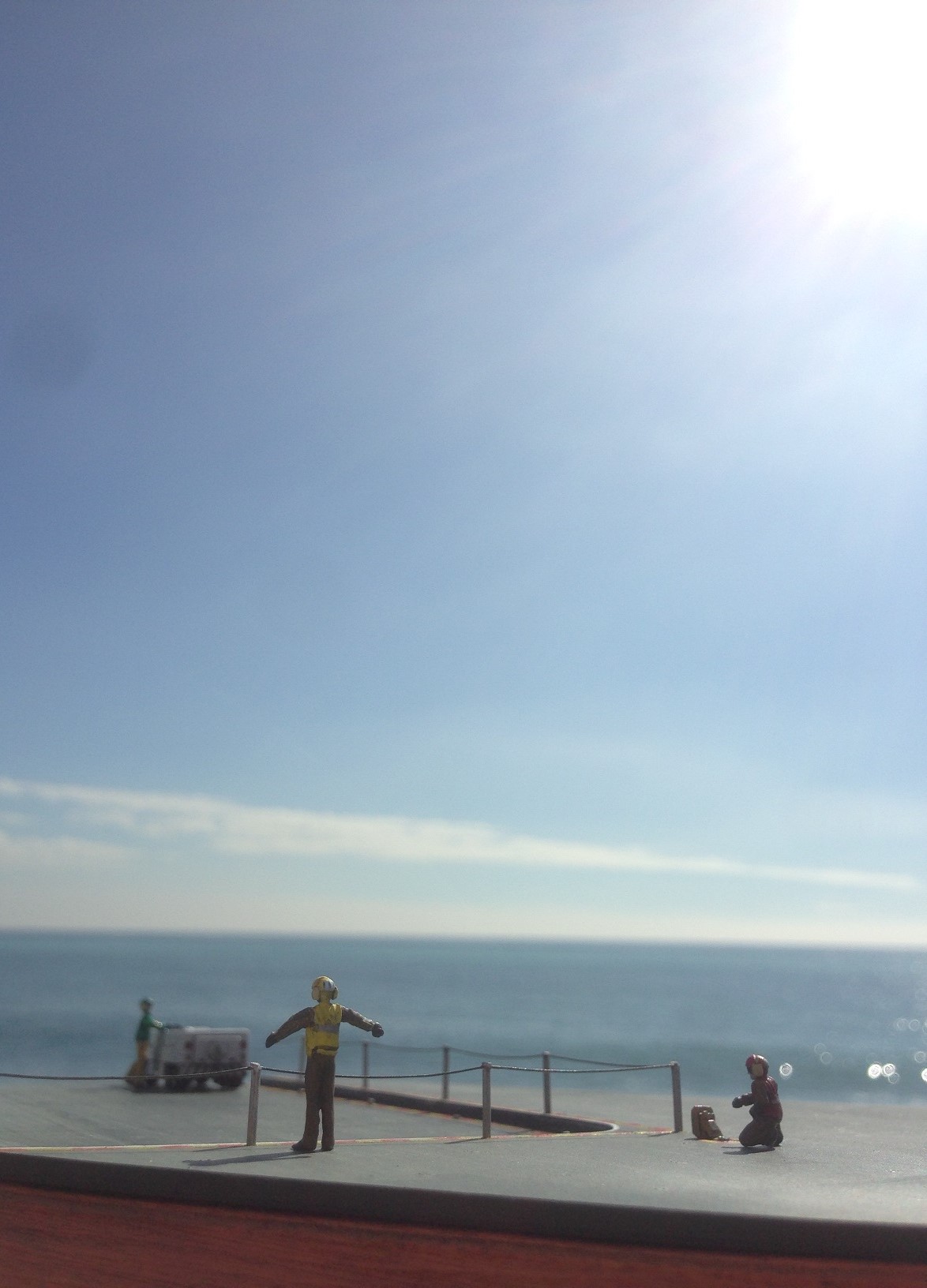 クァドランを立たせる甲板が完成しました。 昨日は久々に天気が良かったので近くの海まで行って撮影してきました。 ↓小物の塗装は黒サフ→グレーサフ→白サフの順に影を残しつつ缶で重ね吹き。 ↑電源車はアーマードファクトリー付属のものを使用。後部のフタを閉じました。 色は自衛隊のも米空母のも白いようなので、白サフのままで。 ↑電源車の塗装は米空母のを参考にバンパーに白黒の縞模様をマスキングなしの筆描き。 ヘッドライトは銀を塗ってからクリアーブル...