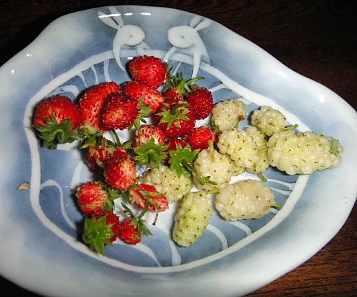 JUGEMテーマ:趣味の園芸 今朝、窓先で栽培しているアルパインストロベリーの赤くなった実を採取。 「よつぼし」の品種もうどんこ病が出ていましたが、「やさお酢」を散布していた効果か、実がカビていませんでした。 ホワイトマルベリーも実も熟してきたので数個採取できました。